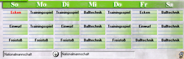 3.5. Trainingswoche "Training A" ist die Standarttrainingswoche und fördert die Eingespieltheit und die meisten Fähigkeiten (Zweikampf, Spielmacher, Spielübersicht, Torinstink, Kopfball, Flanken).