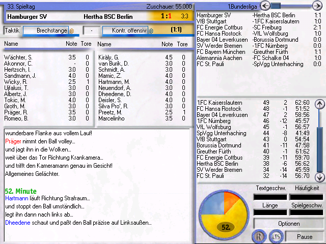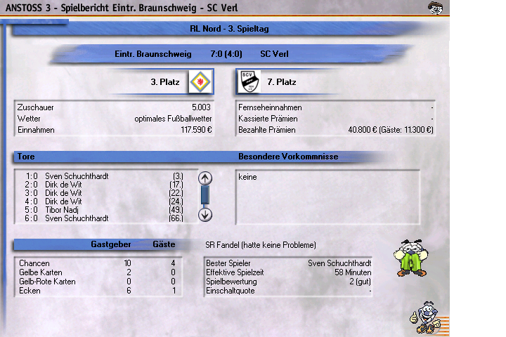 Jupp, Dirk de Wit hat Lust gehabt, Michi Tönnies zu jagen. Der alte Freistoßgott knipst gegen den SCV ordentlich was weg, ich gehe davon aus, dass Sven Schuchhardt - nicht, wie im Screen "Schuchthardt" geschrieben! - genügend Scorerpunkte geliefert hat, um vor DdW als Mann des Spiels einzulaufen.