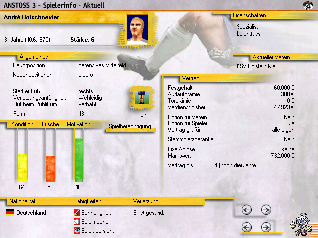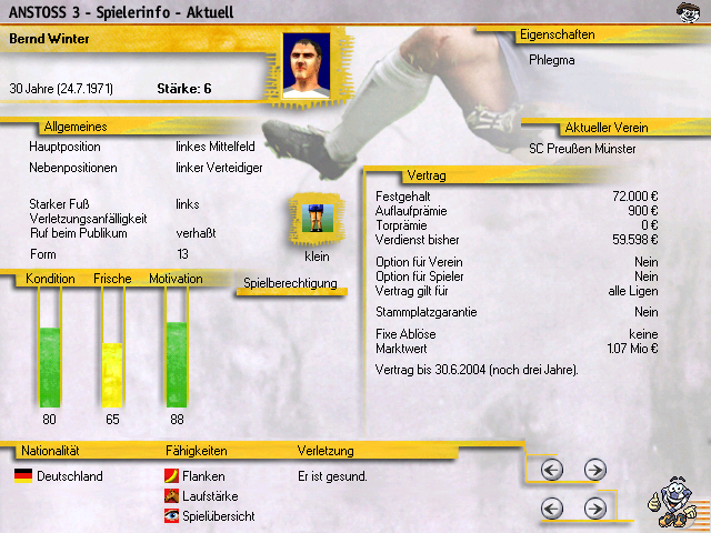 Ein in den Herbst seiner Karriere kommender, verhaßter 6er mit einer negativen Eigenschaft, kleiner Talentveranlagung, negativer Spielübersicht, keiner Laufstärke und der Unfähigkeit zu Flanken - der Knilch spielt auch noch auf der Außenbahn, was zur Hölle????!! der dank Unmotiviertheit noch nicht mal seine effektive Stärke abruft, bekommt es hin, einen MW über einer Million zu haben. Immerhin ist der wehleidige André Hofschneider noch schlimmer dran.