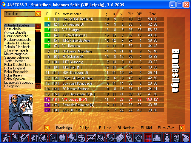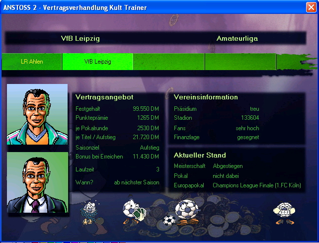 In jedem Fall dürfte der Lizenzentzug (per 2-Milliarden-Bug) für die Challenge sogar die vorzugswürdige Abstiegsvariante sein (sofern man man sie nicht als Cheaten betrachtet), weil man dann weiterhin in der Liga die Spiele gewinnen "darf", sodass Form des Teams und Vorstandsvertrauen im oberen Bereich bleiben.