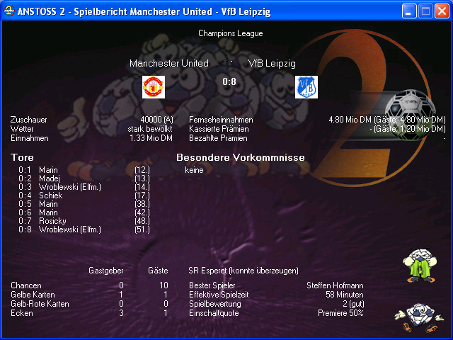 Manchester war mit 78 schon weit oben gemessen an dem, was einem bei Computermannschaften begegnet. Nur sehr selten schaffen es KI-Vereinsmannschaften bis in den 80er-Bereich. Solche Mannschaften werden dann allerdings schwer zu schlagen sein, wenn mal als Zweit- oder sogar Drittligist auf sie trifft. Viel Glück (mit dem Zufallsgenerator und save & reload)!
