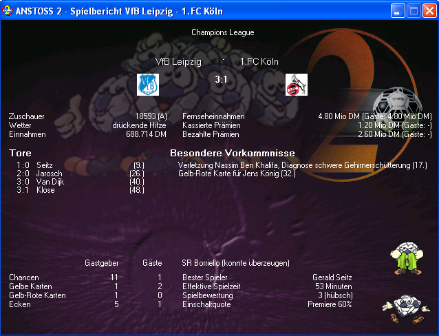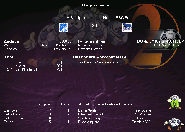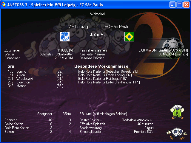 Es ist vollbracht, Weltpokalsieg als Regionalligist. Ging in dem Spiel heiß her – musste mit 9 Mann in die Verlängerung (und ich selbst wurde auch schon auf die Tribüne geschickt), in der dann jeweils beide noch einen Platzverweis sahen. Man beachte die effektive Spielzeit  :faszinierend: