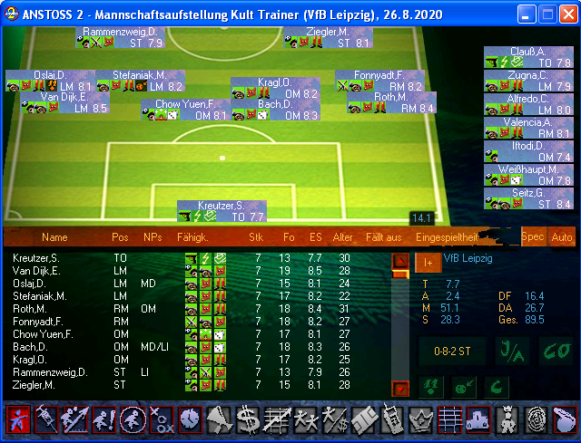 Eine Abwertung von Stärke 8 auf Stärke 7 wird es am Ende der mit Alter 34 bestrittenen Saison mit Sicherheit geben, doch auch dann sollten weitere Sternstunden drin sein. Im besten Fall wird mein Spieler zwischen Stärke 8 (Sternstunde in der Winter-Aufwertungsrunde) und Stärke 7 (altersbedingte Abwertung in der Sommer-Aufwertungsrunde) pendeln, allerdings rechne ich fest damit, dass das Spiel noch zusätzliche Hürden für mich bereithalten wird.